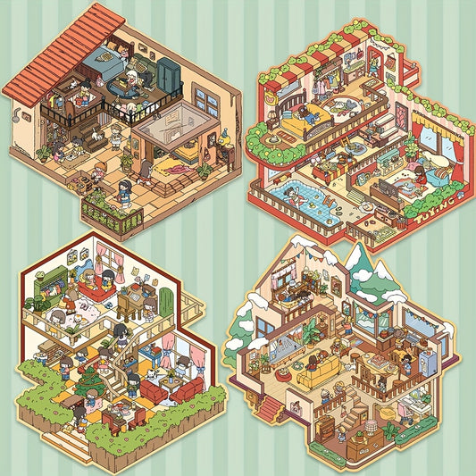 Cartoon Themed Miniature DIY Scene Stickers - Cozy House & Vintage House & Leisure Life & Winter House Party